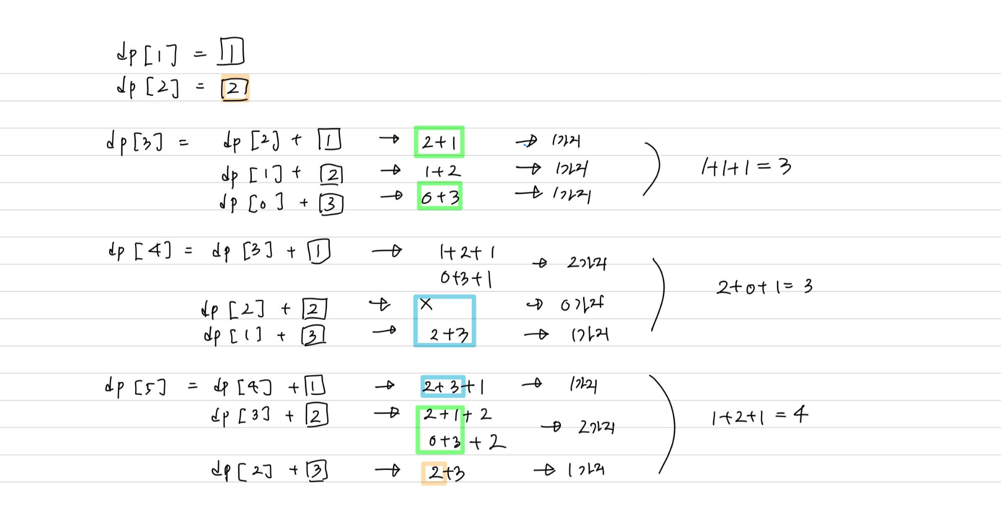 + dp[2]에 3을 더하는 경우 (2+3 -> 1가지)