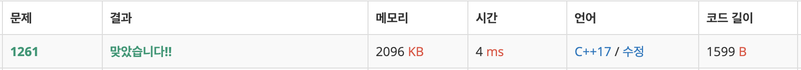 | [C++] 백준 1261번 - 알고스팟(BFS, 메모리초과 해결) (0) | 2021.03.08 |