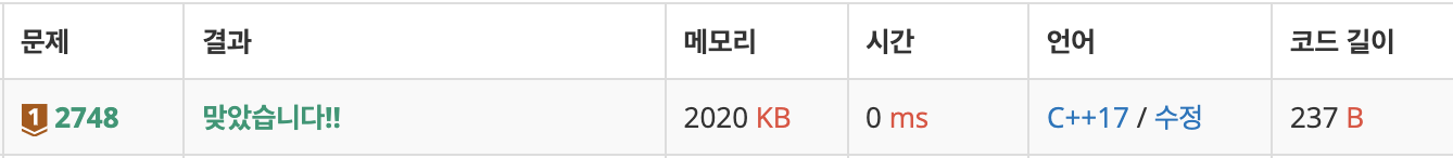 | [C++] 백준 2748번 - 피보나치 수2 (DP, 자료형 주의) (0) | 2021.08.17 |