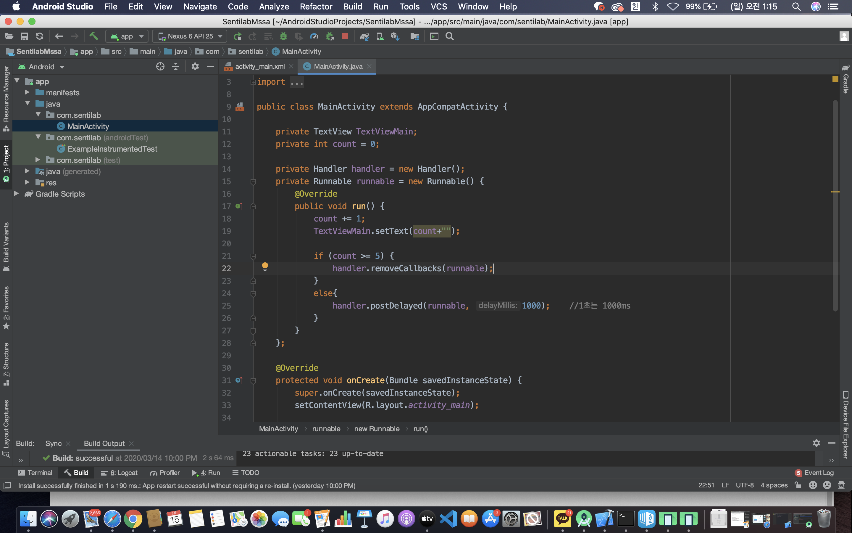 - line 36에서 post() 를 하면 line17 이 실행된다. 처음 count 변수를 0으로 초기화했으므로 run() 이 실행되면 1이 되면서 count가 5가 될 때까지 1초에 1씩 증가한다.