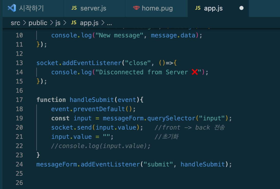line 42와 같이 채팅 메세지를 누가 보냈는지, 뭘 보냈는지에 대한 아이템을 객체 형태로 담아 front 로 전송한다.