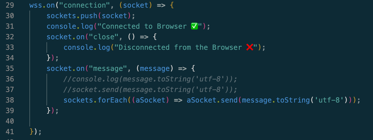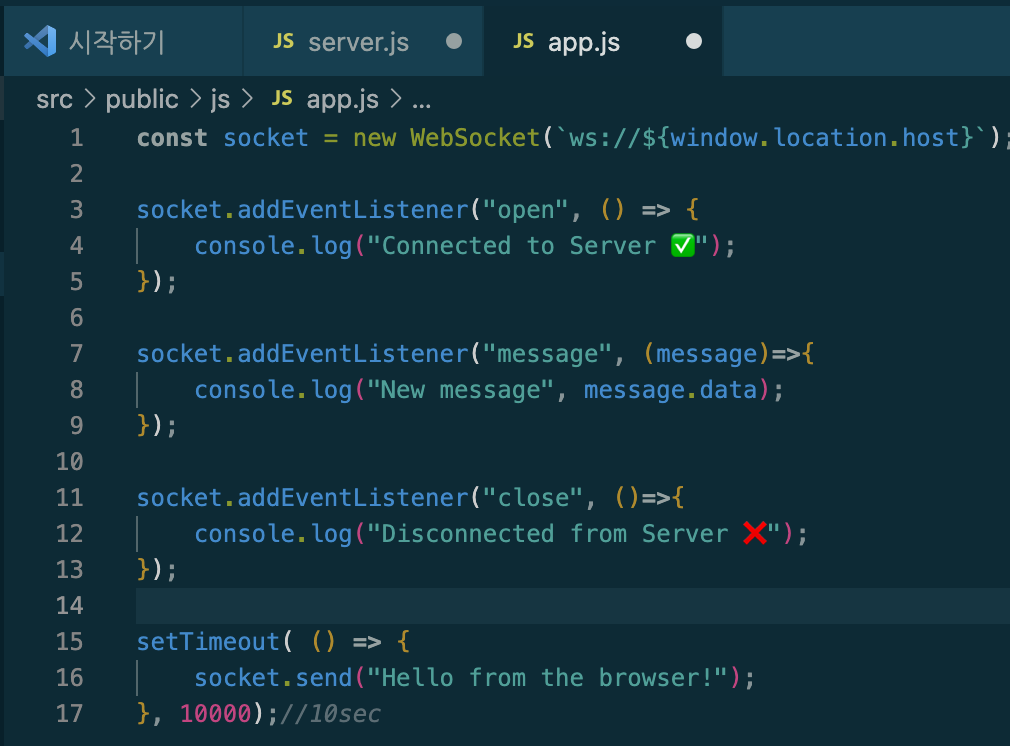 바로 websocket이 브라우저에 있는 API 이기 때문이다. backend 에서는 다양한 프로그래밍 언어를 사용할 수 있기 때문에 API가 어떤 결정을 할 수는 없는 것이다.