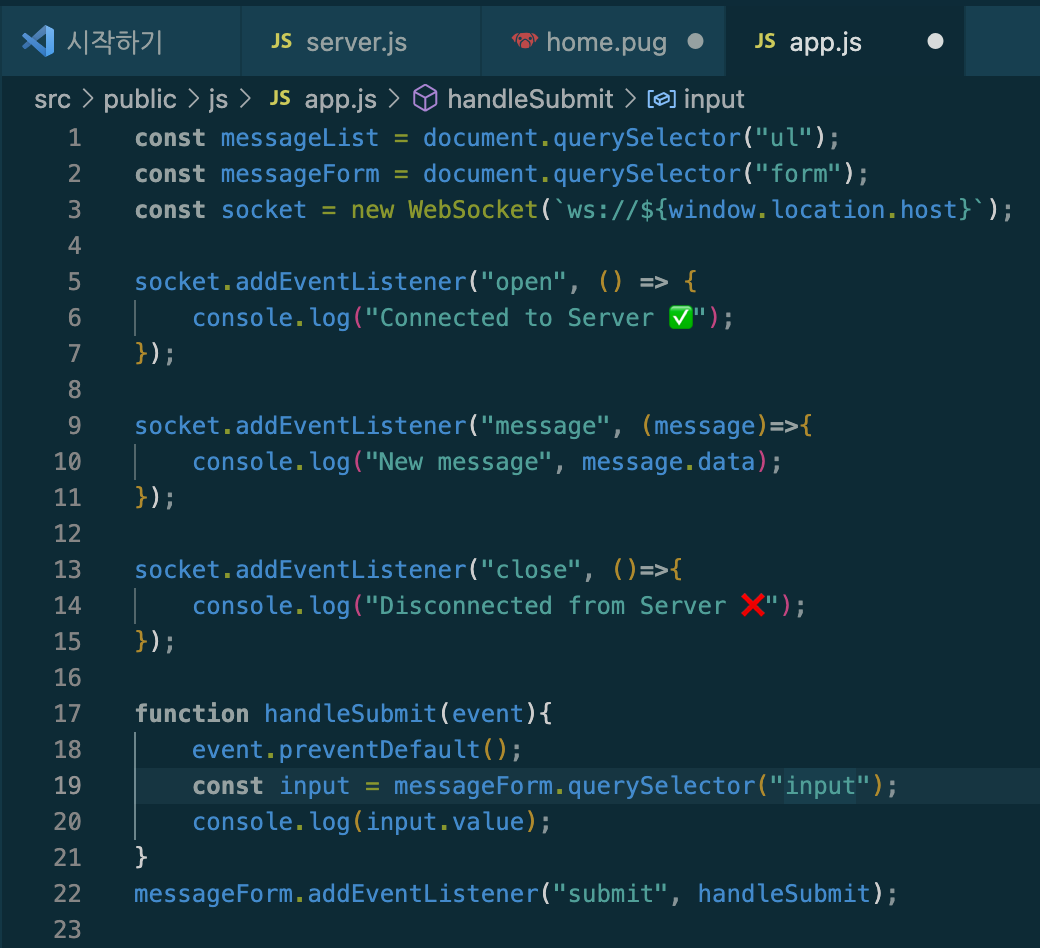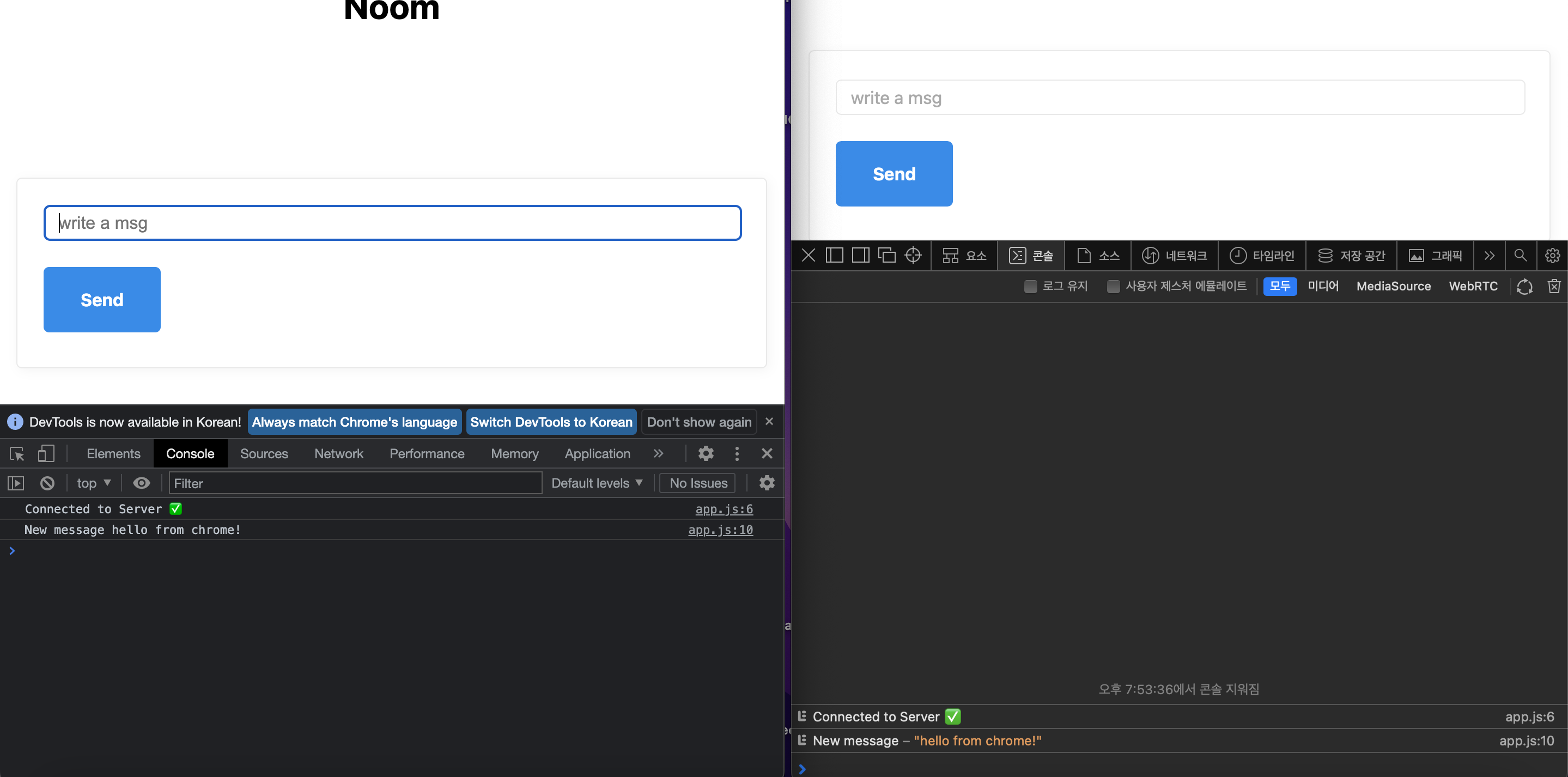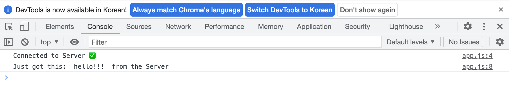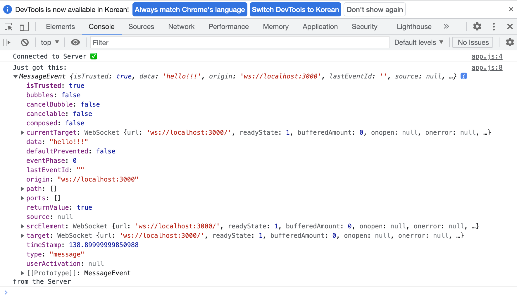 잘 나온다. 여기서 주목할 점은 socket 이 데이터를 저장할 수 있다는 것이다. (socket["nickname"] = ....)