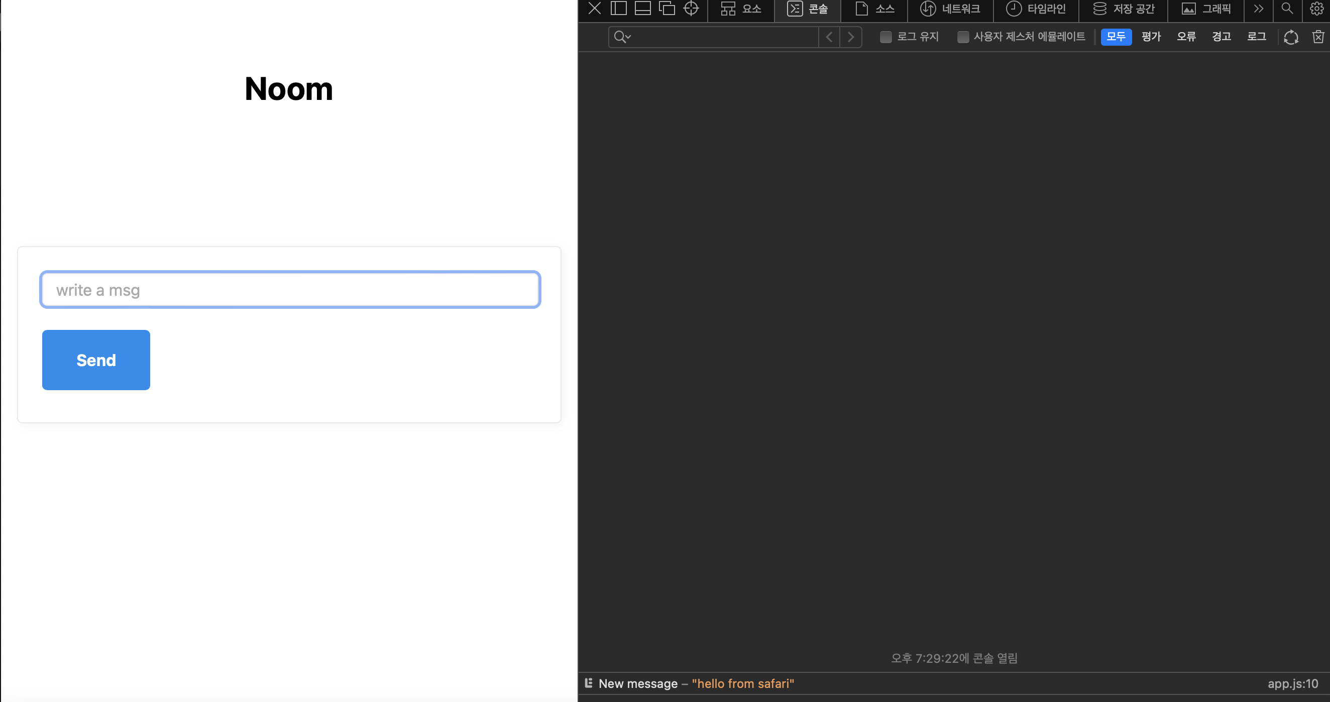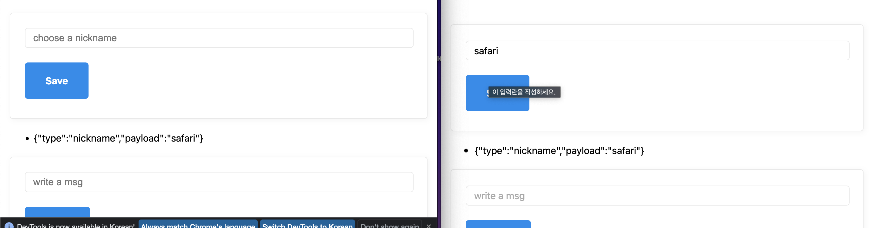 그럼 메세지를 입력했을 때, 입력한 메새지만 나오게 된다. 닉네임에 입력해도 아무것도 스크린에 뜨지 않는 걸로 보아 message type 이 구분되는 것임을 알 수 있다.