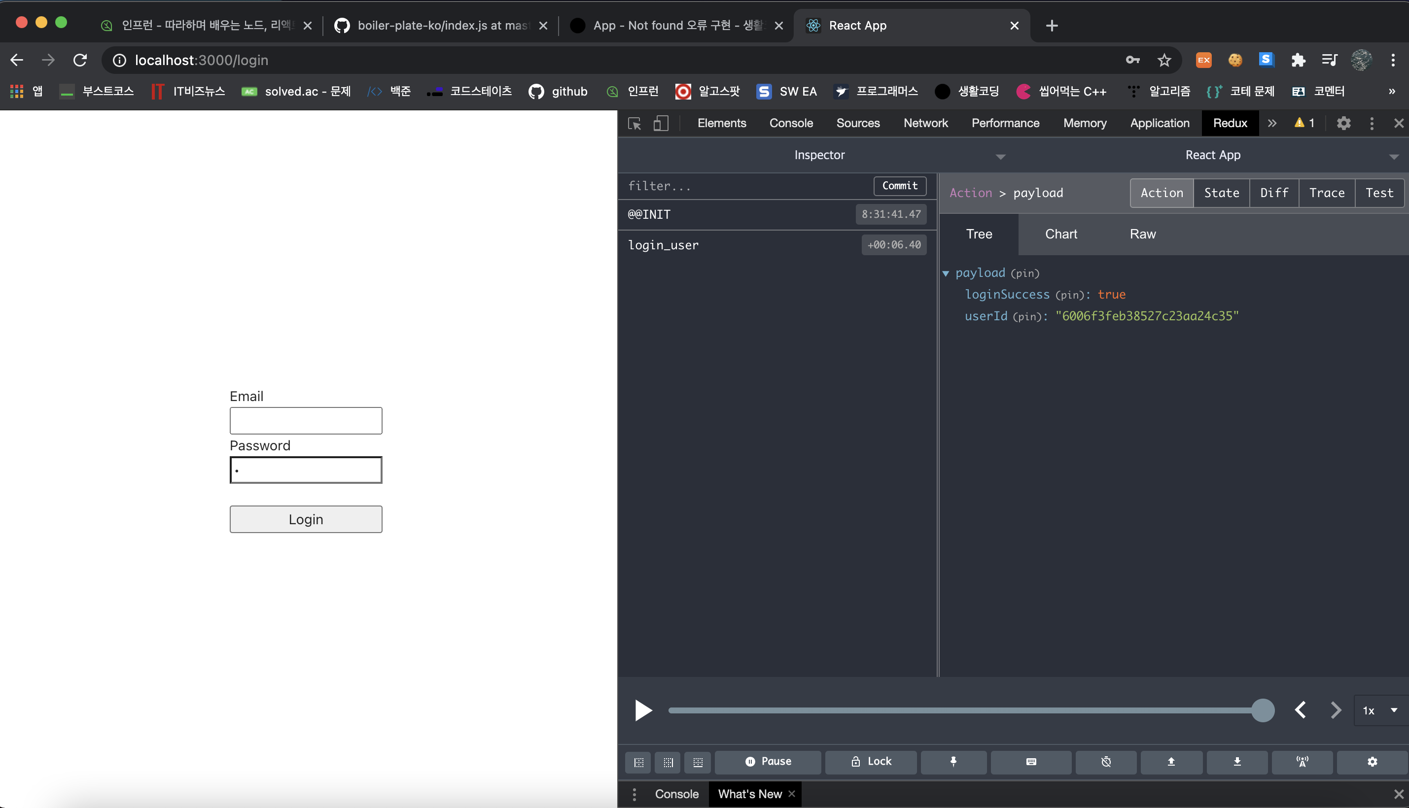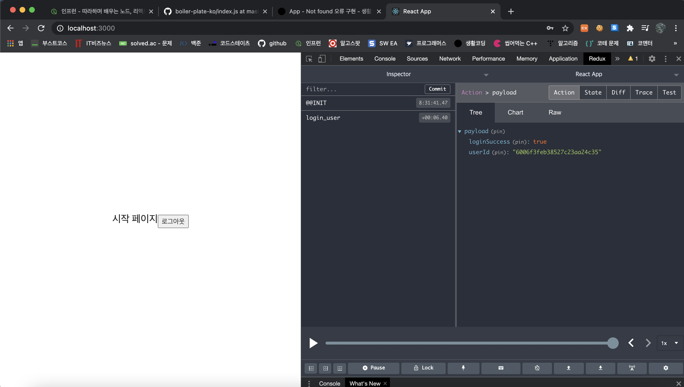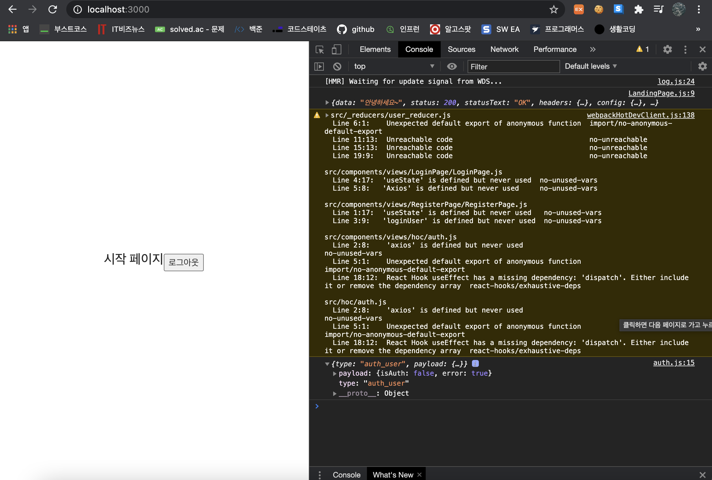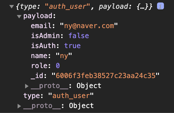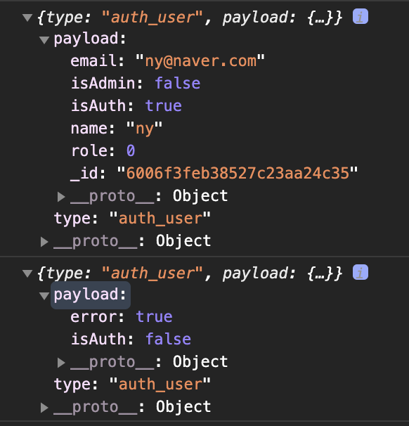위에 있는 payload.isAuth는 로그인 된 상태이고 아래 있는 payload.isAuth는 로그아웃된 상태이다. 각각 true, false 이므로 이에 맞게 코드를 작성하자.