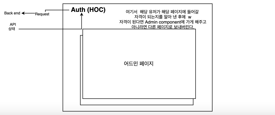 예를 들어 LandingPage를 넣으면 Auth는 Backend에 Request를 날린다. 현재 LandingPage에 들어와있는 사람의 상태 정보(로그인이 되어 있는지 아닌지, Admin인지 아닌지 등)를 Auth로 가져온다.