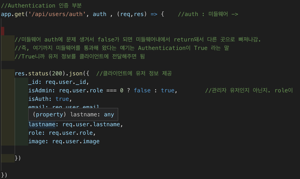 여기로 그 요청이 넘어온다. 여기서는 토큰을 사용해서 쿠키 안에 토큰을 집어 넣는다. 그 쿠키를 보고 로그인 한 유저인지 아닌지를 판단하고 그 결과를 리액트에 넘겨준다.
