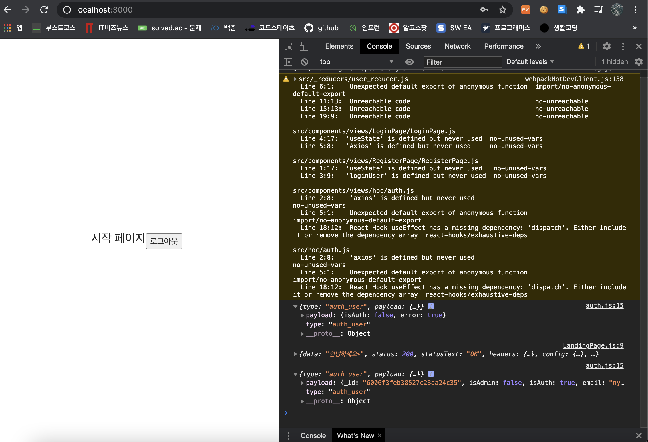 위에 있는 payload.isAuth는 로그인 된 상태이고 아래 있는 payload.isAuth는 로그아웃된 상태이다. 각각 true, false 이므로 이에 맞게 코드를 작성하자.