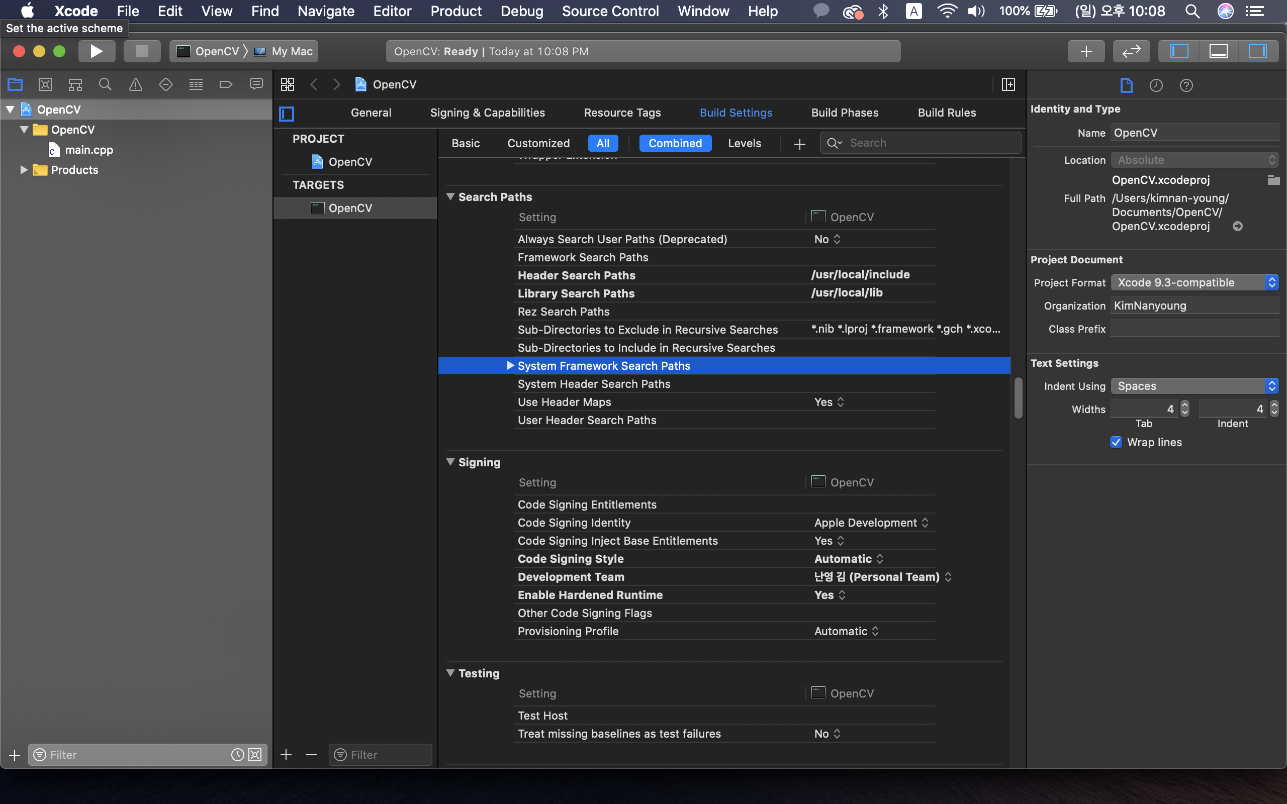 c++ commandline 으로 프로젝트를 생성한 후 Header Search Paths와 Library Search Paths를 아래와 같이 설정한다.