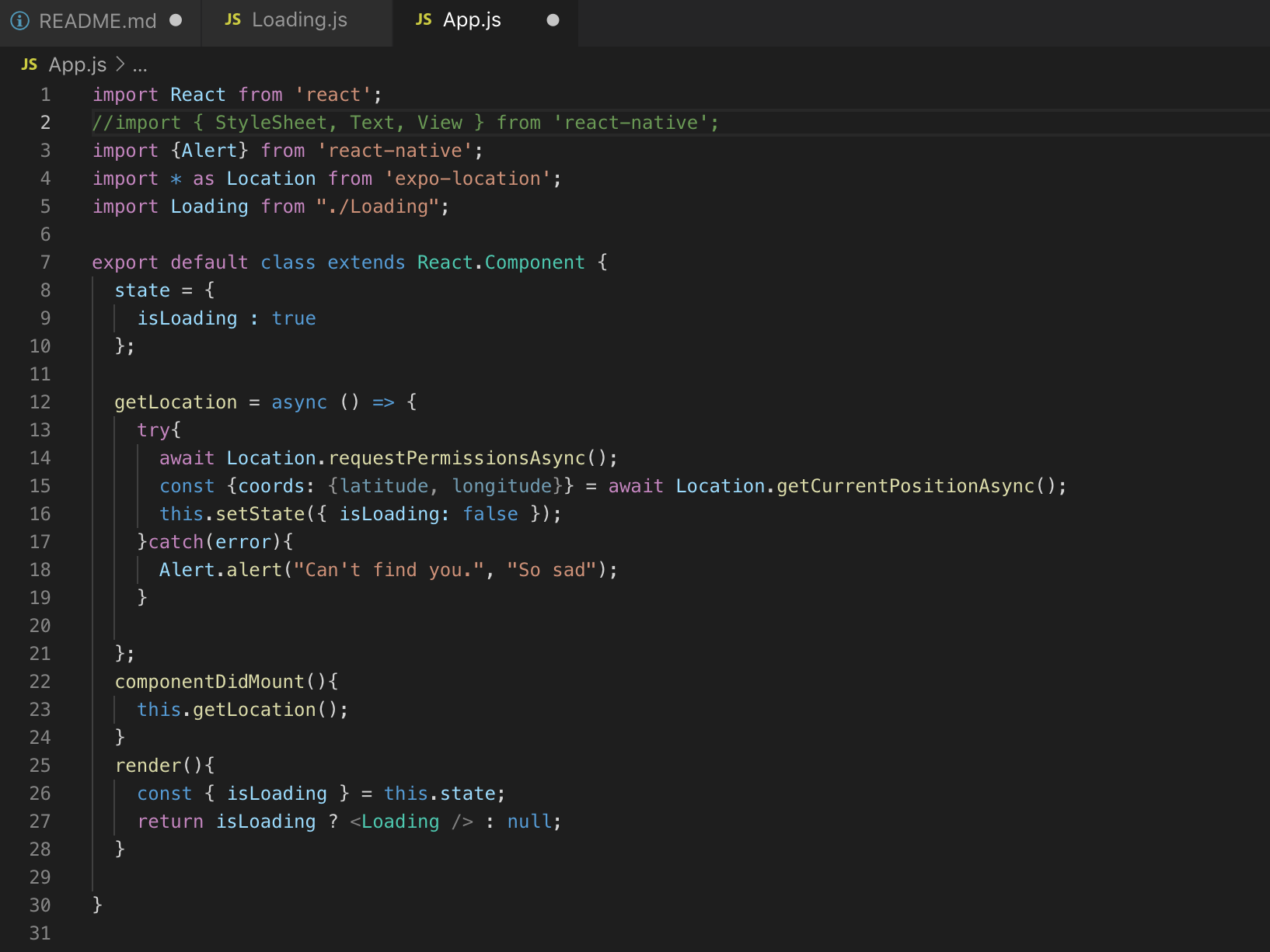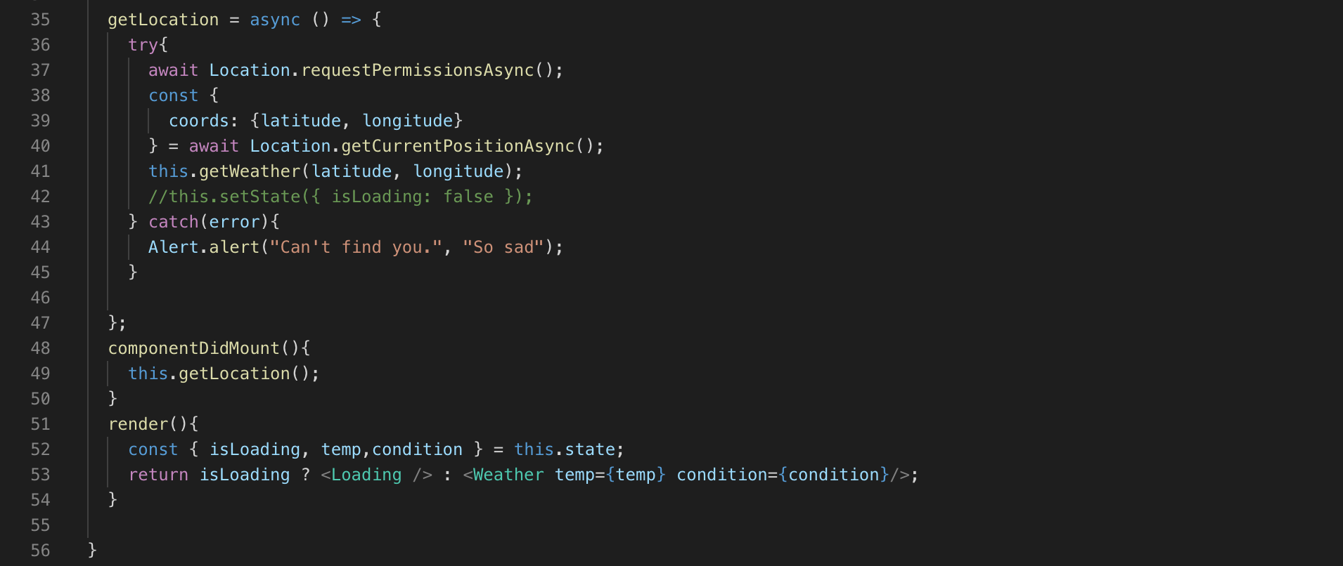 - App.js 파일의 맨 아래 부분에 render() 안에서 ‘null’을 <Weather /> 로 바꿀 때, 하나씩 수동으로 타이핑하면 코드를 인식하지 못하는 것 같다. <Weather></Weather> 로 자동 생성 되도록 하면 자동으로 App.js 파일의 상단에 Weather가 import 됨을 확인할 수 있다. 그럼 오류가 해결된다.
