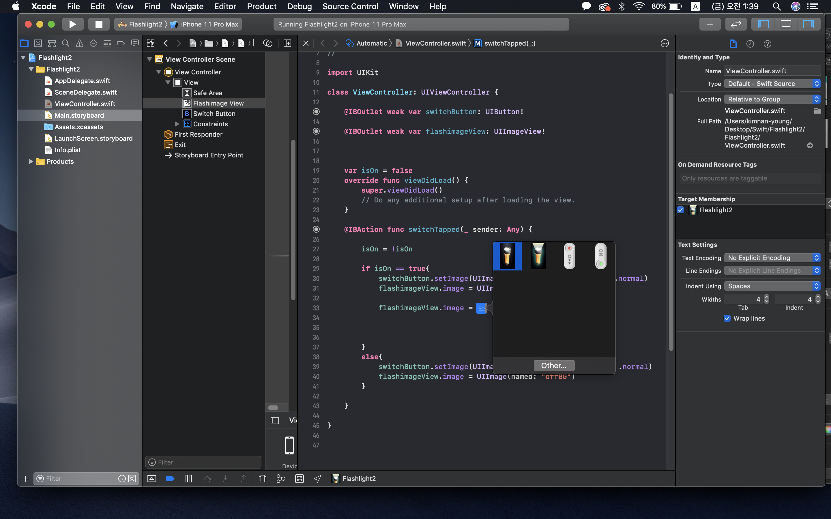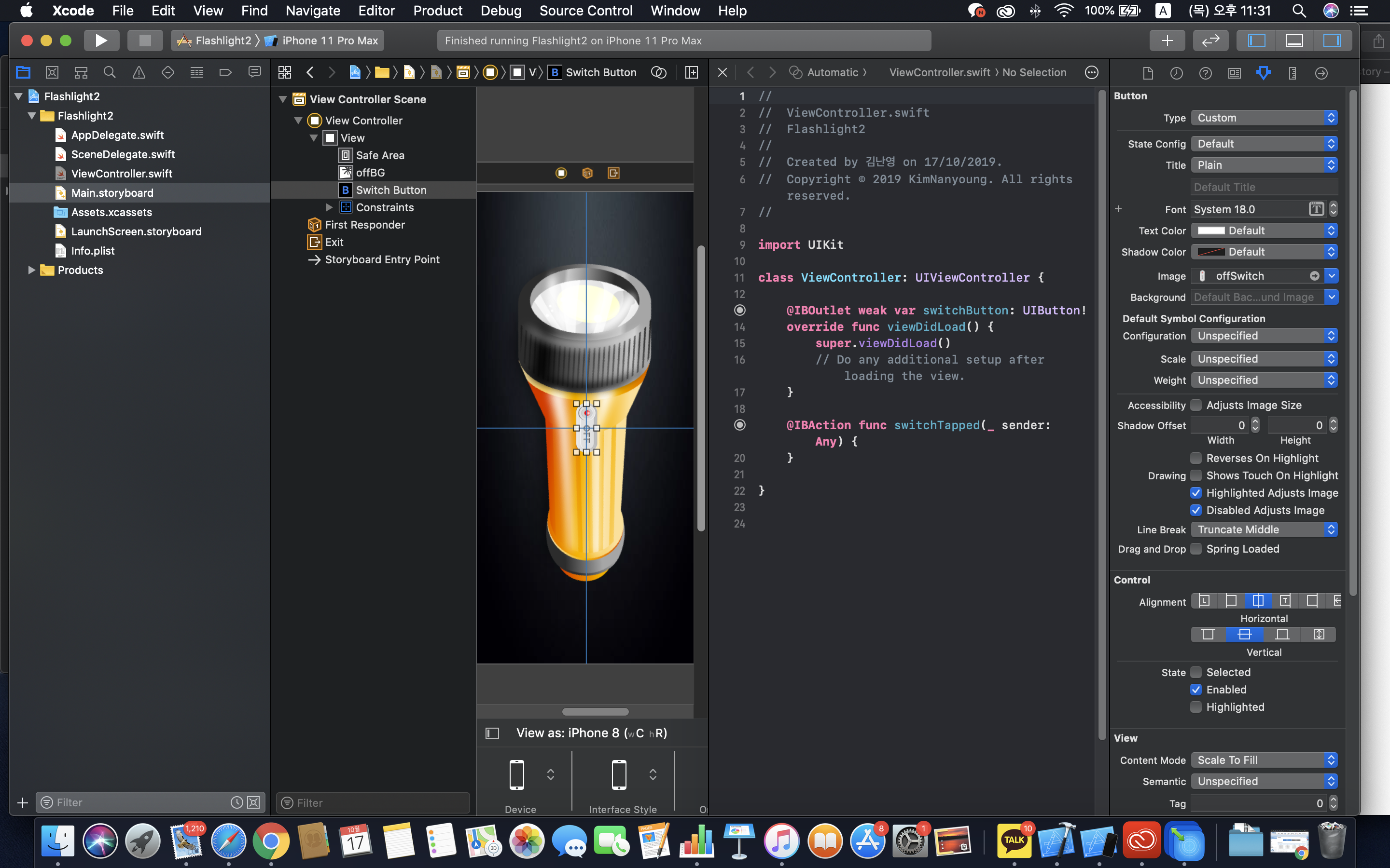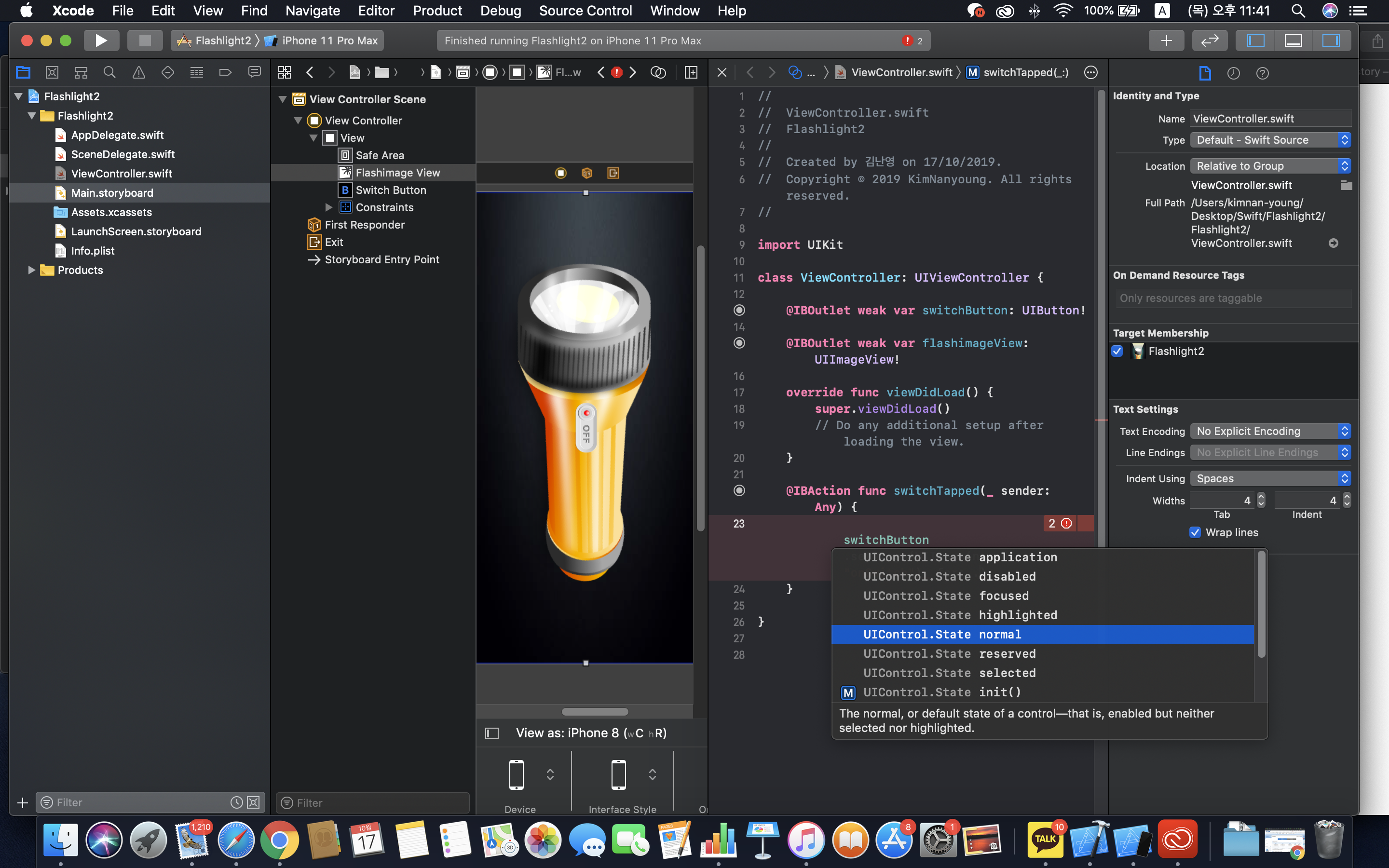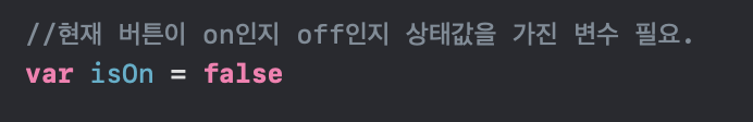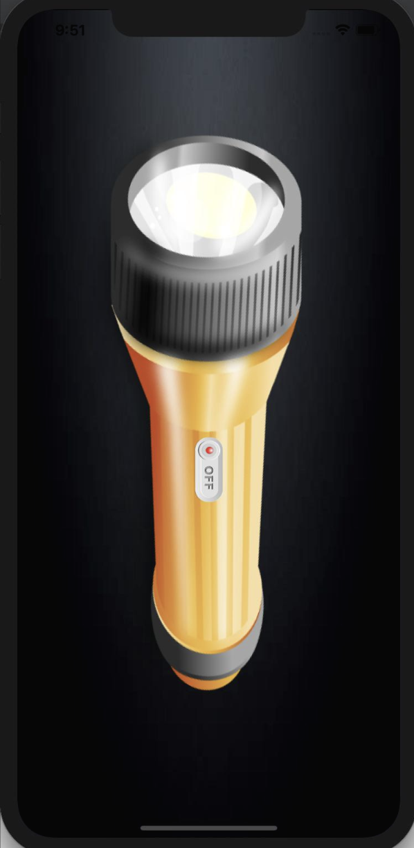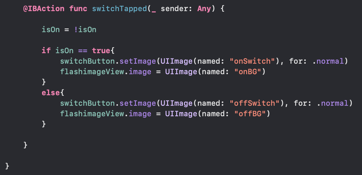 - isOn의 초기값이 false이므로 isOn이 true의 값을 가지면 손전등이 켜지고, 다시 switchTapped()가 실행되어 isOn이 false가 되면 손전등이 꺼진다.