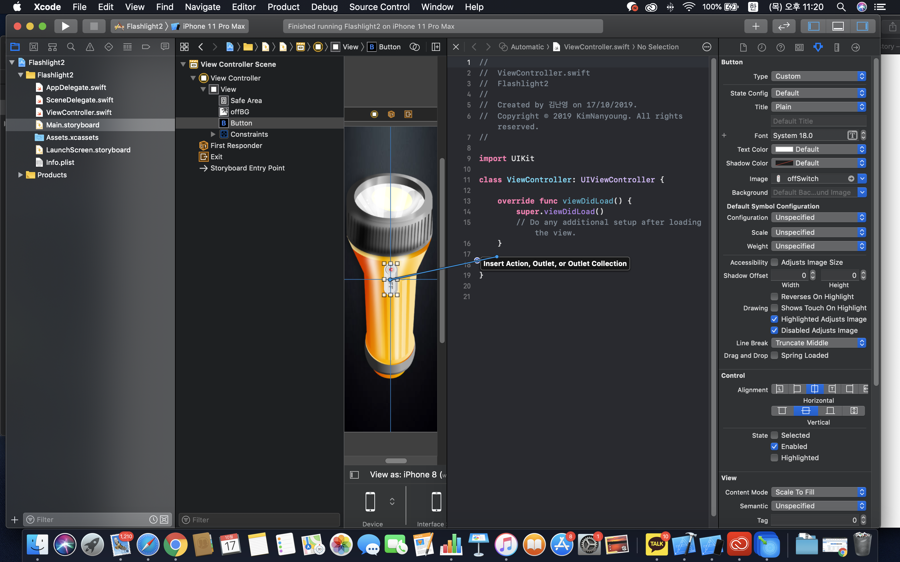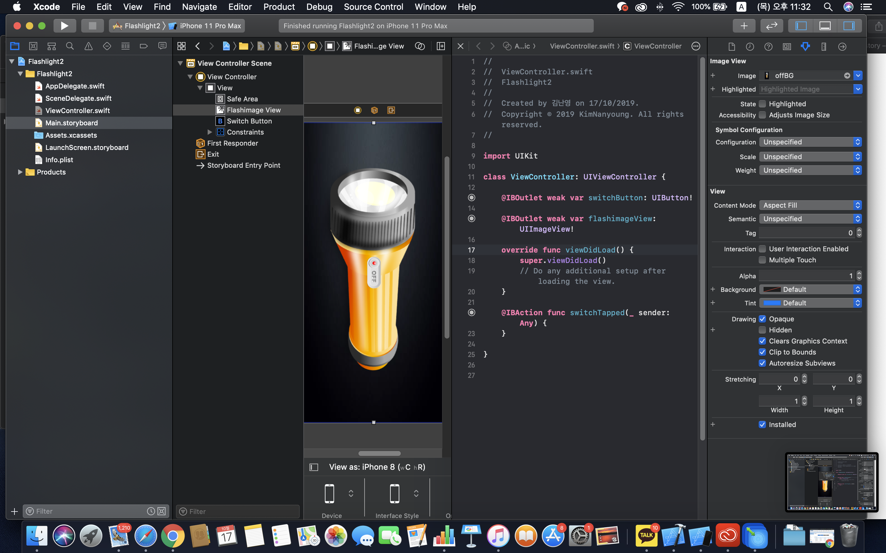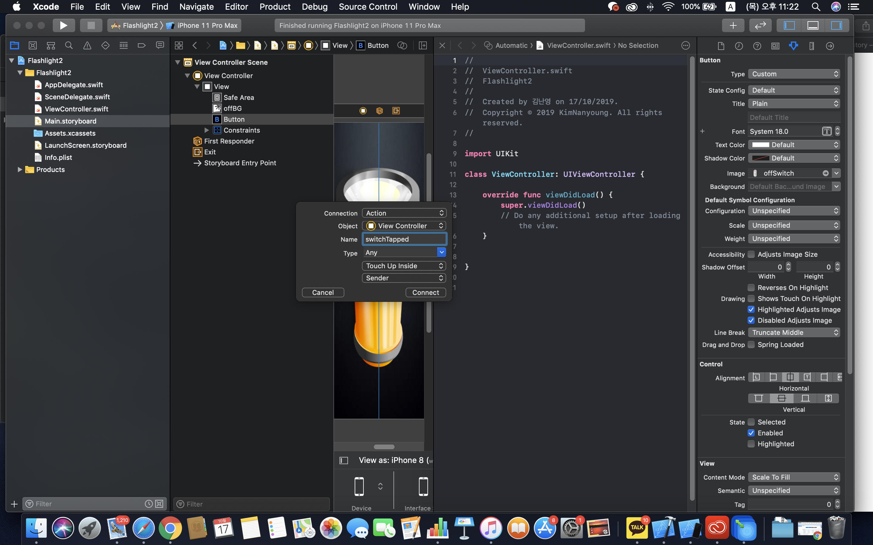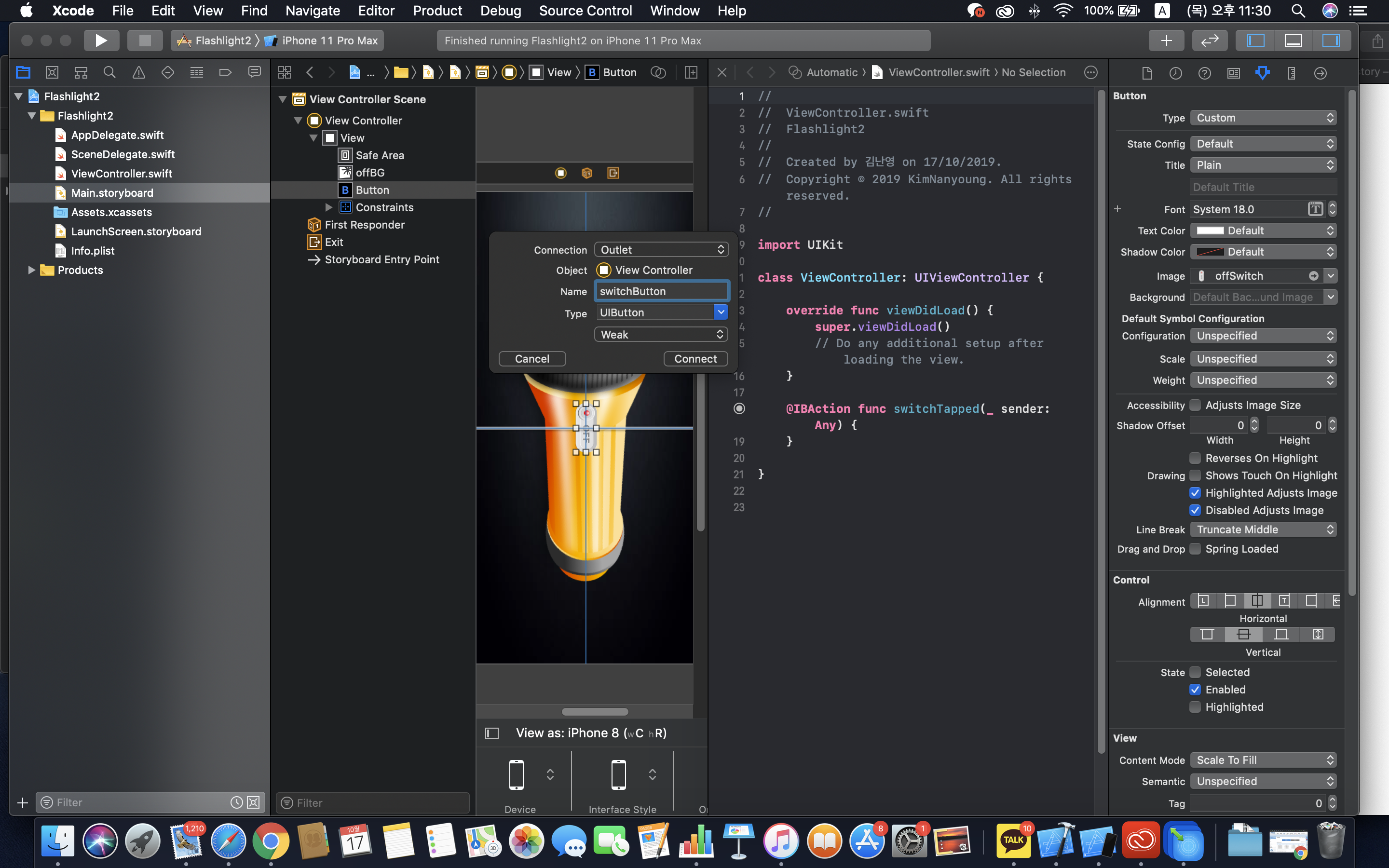 - isOn의 초기값이 false이므로 isOn이 true의 값을 가지면 손전등이 켜지고, 다시 switchTapped()가 실행되어 isOn이 false가 되면 손전등이 꺼진다.