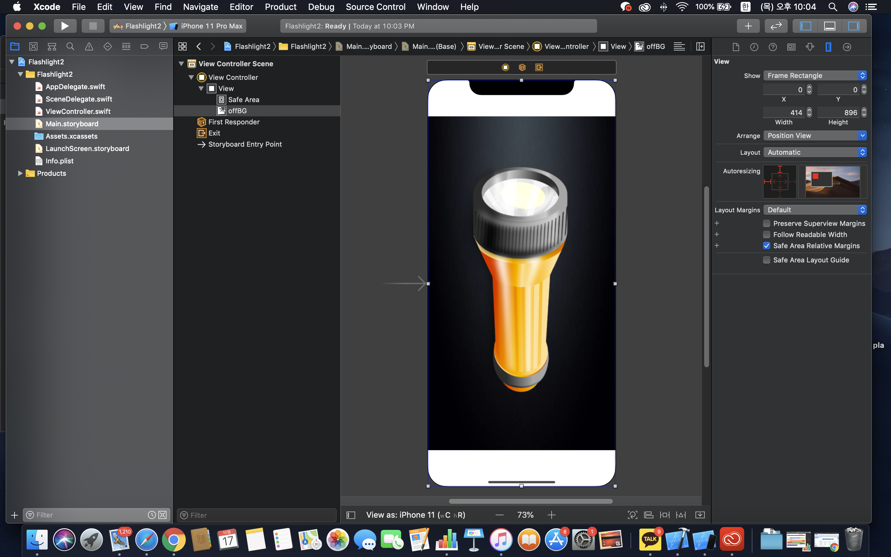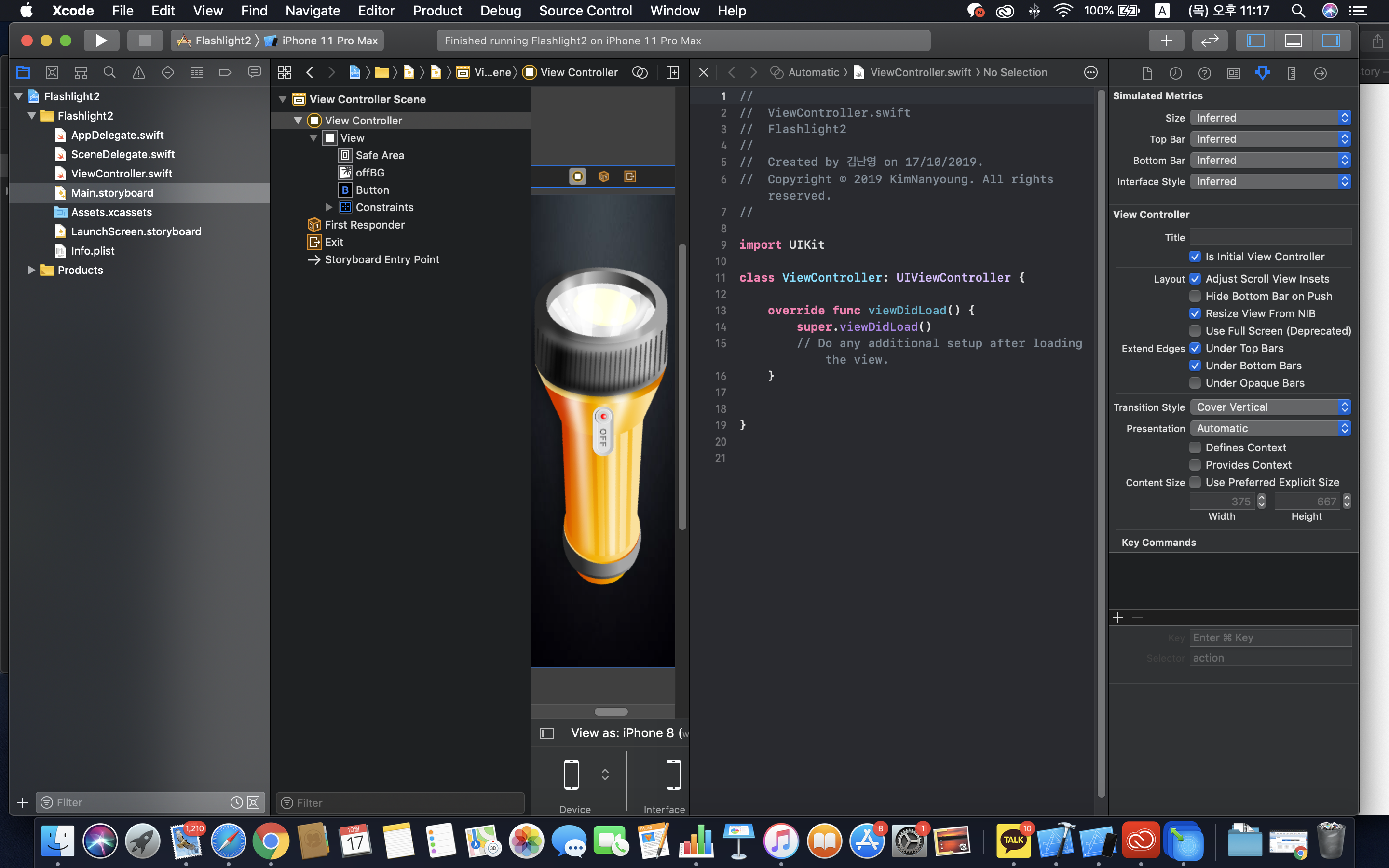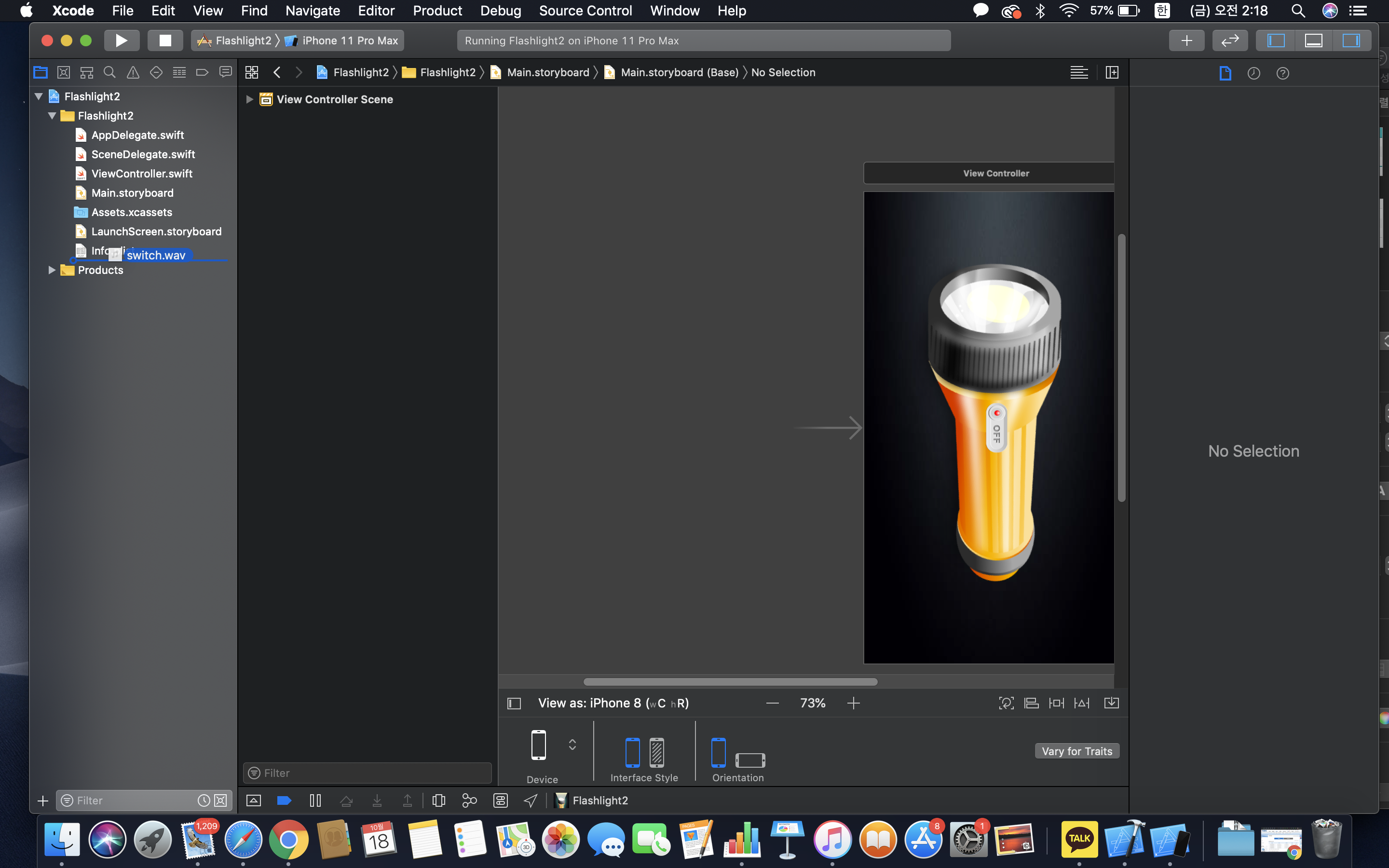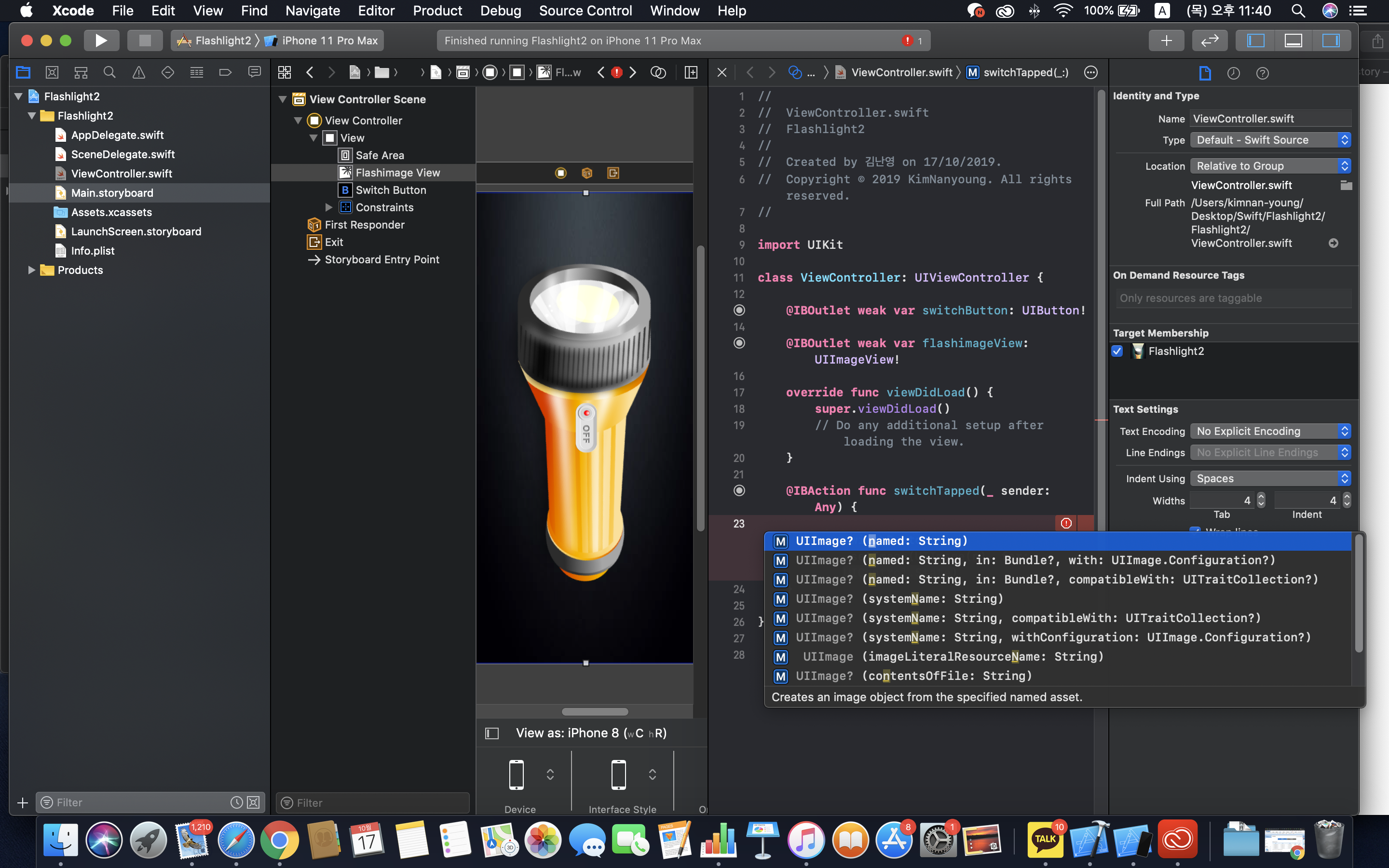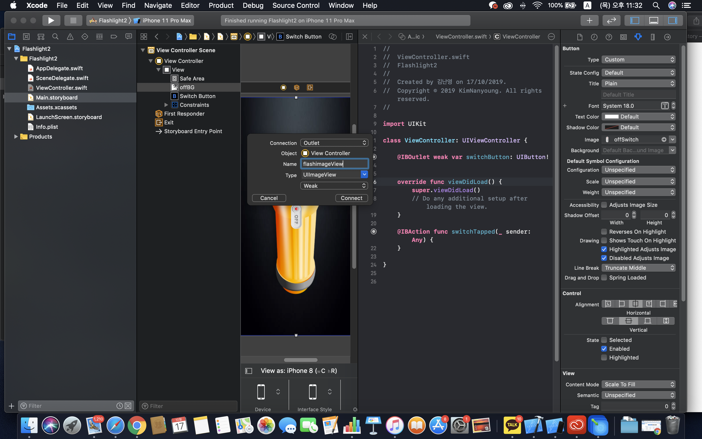 - isOn의 초기값이 false이므로 isOn이 true의 값을 가지면 손전등이 켜지고, 다시 switchTapped()가 실행되어 isOn이 false가 되면 손전등이 꺼진다.