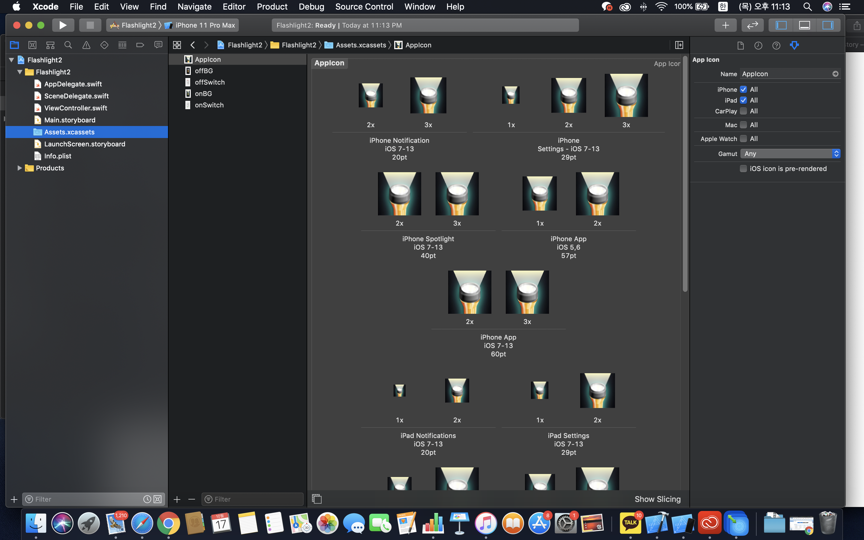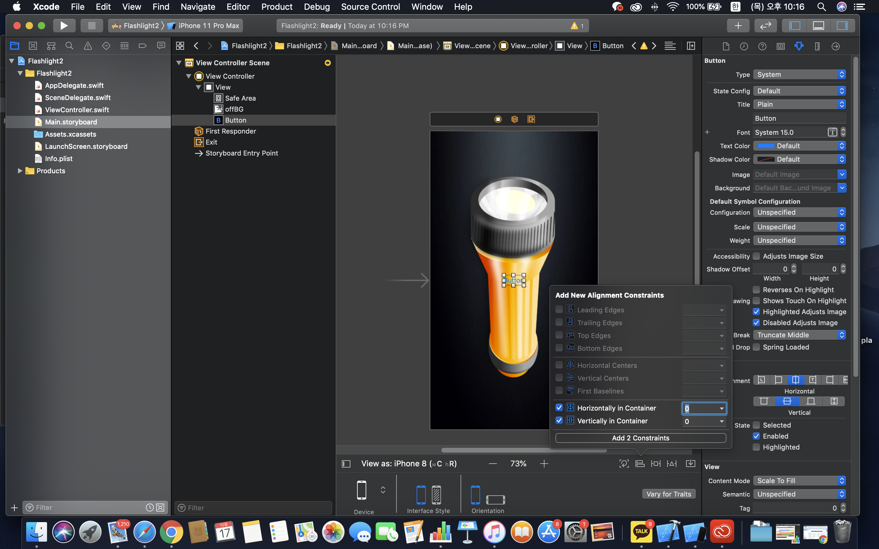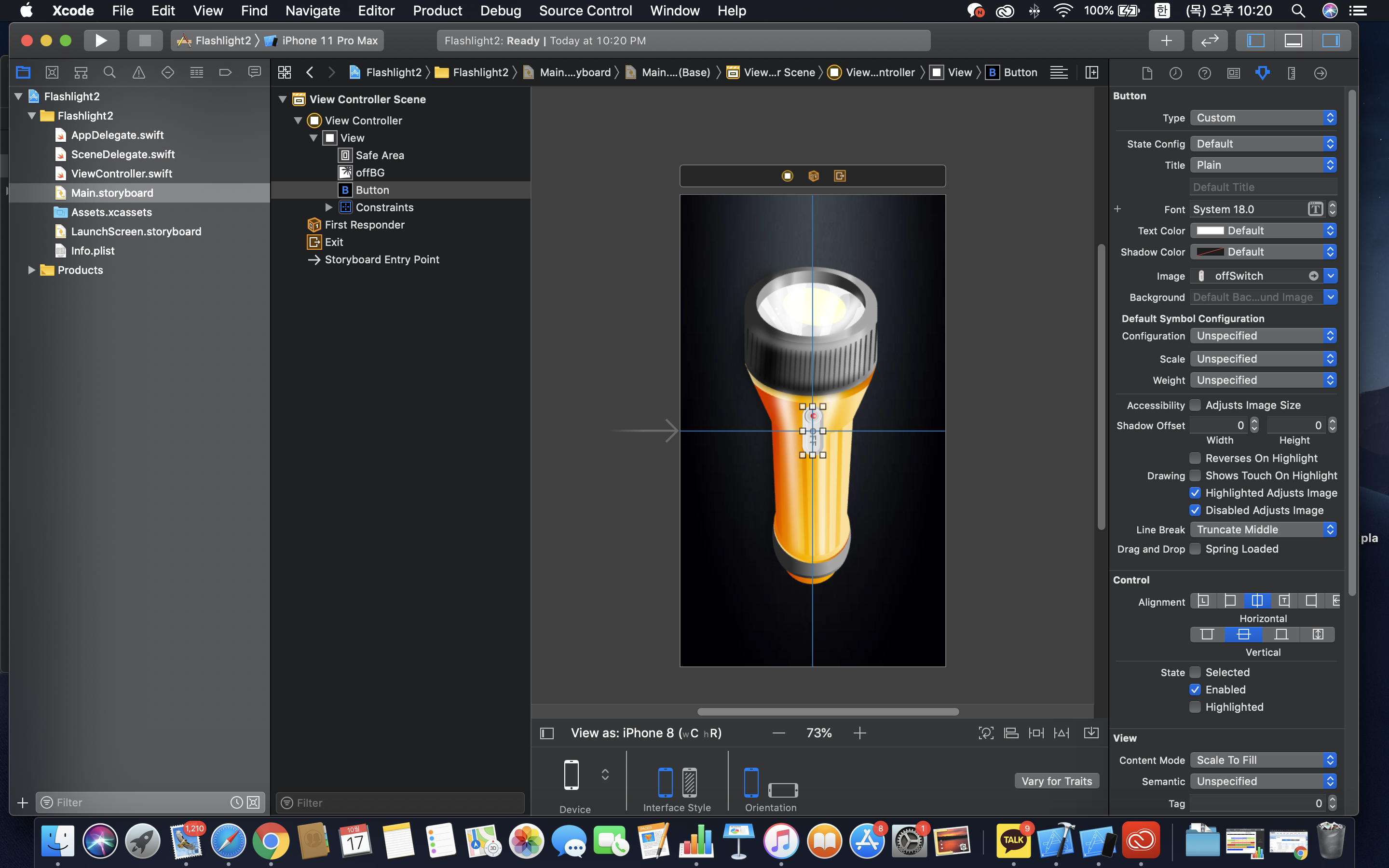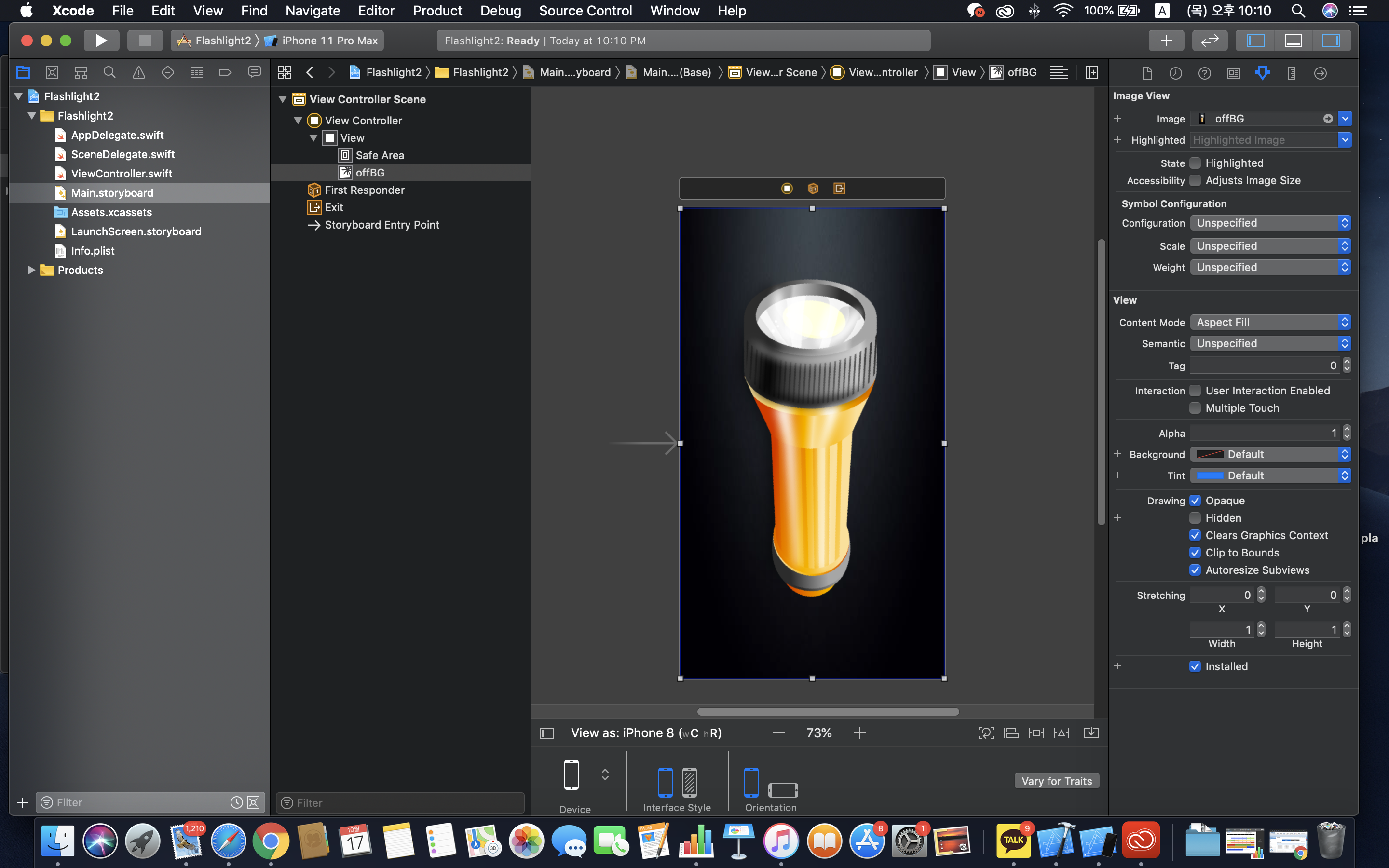 - isOn의 초기값이 false이므로 isOn이 true의 값을 가지면 손전등이 켜지고, 다시 switchTapped()가 실행되어 isOn이 false가 되면 손전등이 꺼진다.