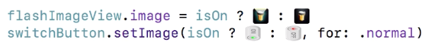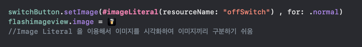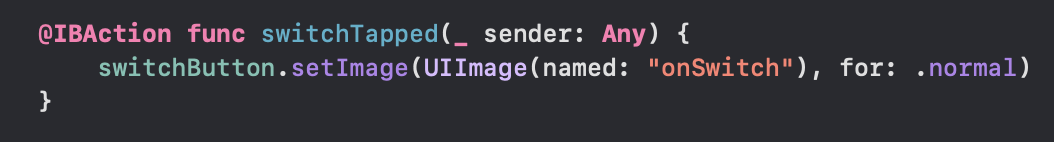 - 첫번째 파라미터 : UI Image 타입이 들어간다. UI 인스턴스의 생성자를 호출하여 인스턴스를 만든 후 넣어준다. 여러개의 생성자 중 UIImage?(named : String) 은 특정한 파일 이름과 연관된 이미지를 리턴하며 파일 이름은 Assets 폴더의 “onSwitch”라는 이미지 파일이다.