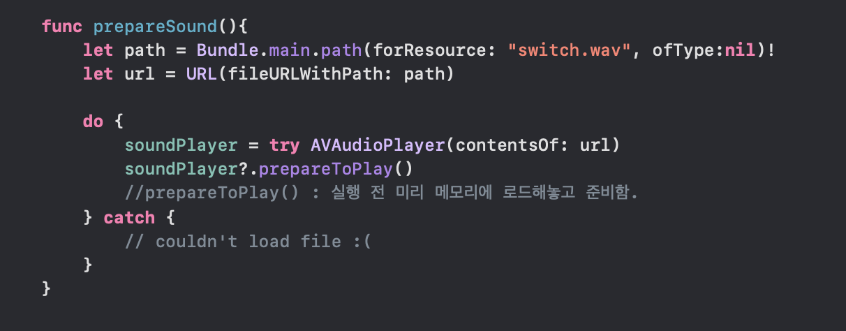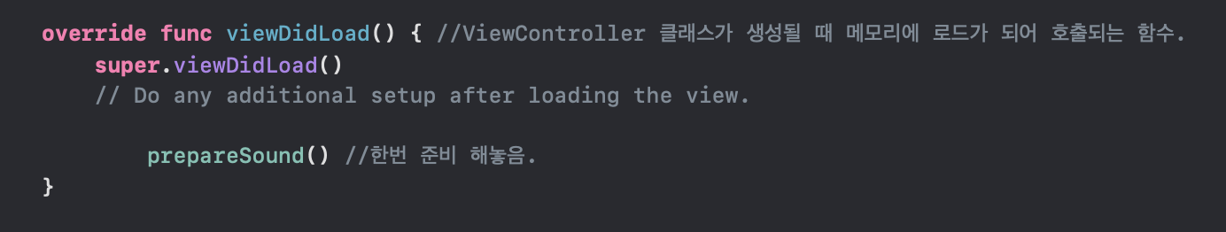 3-2. viewDidLoad()가 실행될 때(ViewController가 로드될 때) prepareSound()를 호출하여 소리 재생 준비를 한다.
